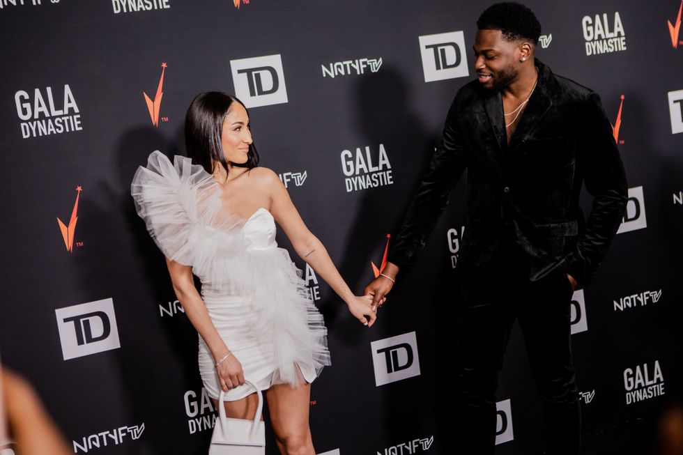 Ines Lalouad et Stevens Dorcellus d'OD étaient si beaux qu'on aurait pu croire qu'ils allaient se marier. Ines portait une robe blanche en tulle avec un sac à main de la marque de luxe Jacquemus, tandis que Stevens portait un complet noir en velours.