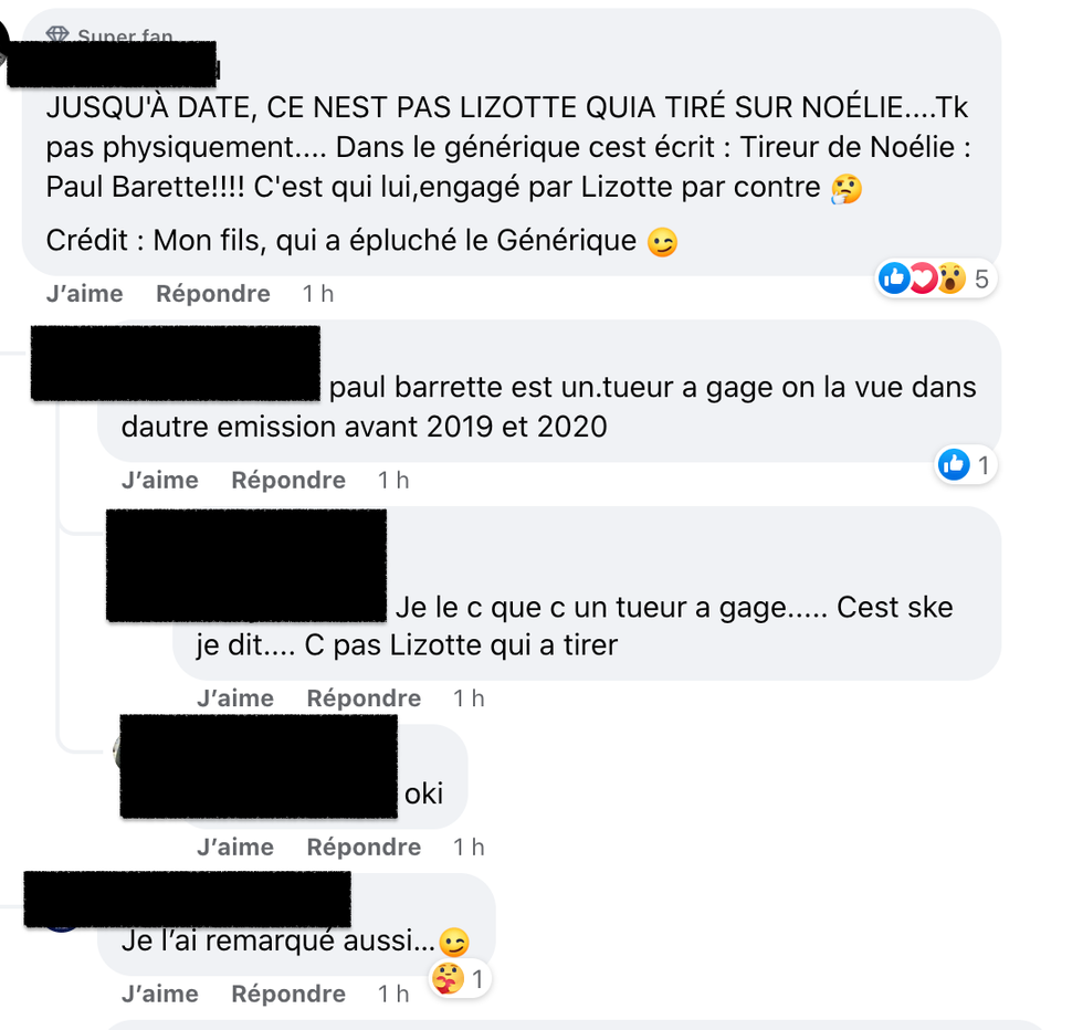 Selon des commentaires sur la page Facebook de l'émission, certain.es membres du public auraient remarqué le nom du tireur de Noélie au générique. Ni celui de Maxime Gibeault ou d’Alex Godbout n'apparait. Il s'agirait plutôt d'un certain Paul Barrette.