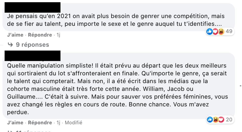 Si certains trouvent ça équitable, cette décision créée majoritairement une vague de déception, alors que plusieurs dénoncent qu'il s'agirait d'une « manipulation » pour avoir une femme en finale, étant donné qu'il est bien connu que Guillaume, Jacob et William sont parmi les favoris.