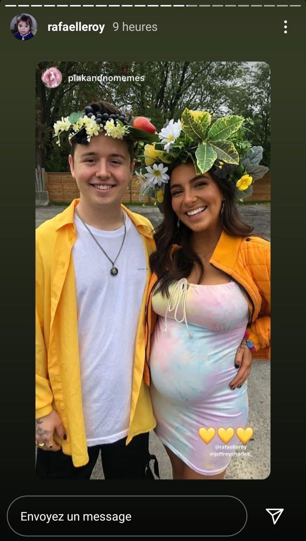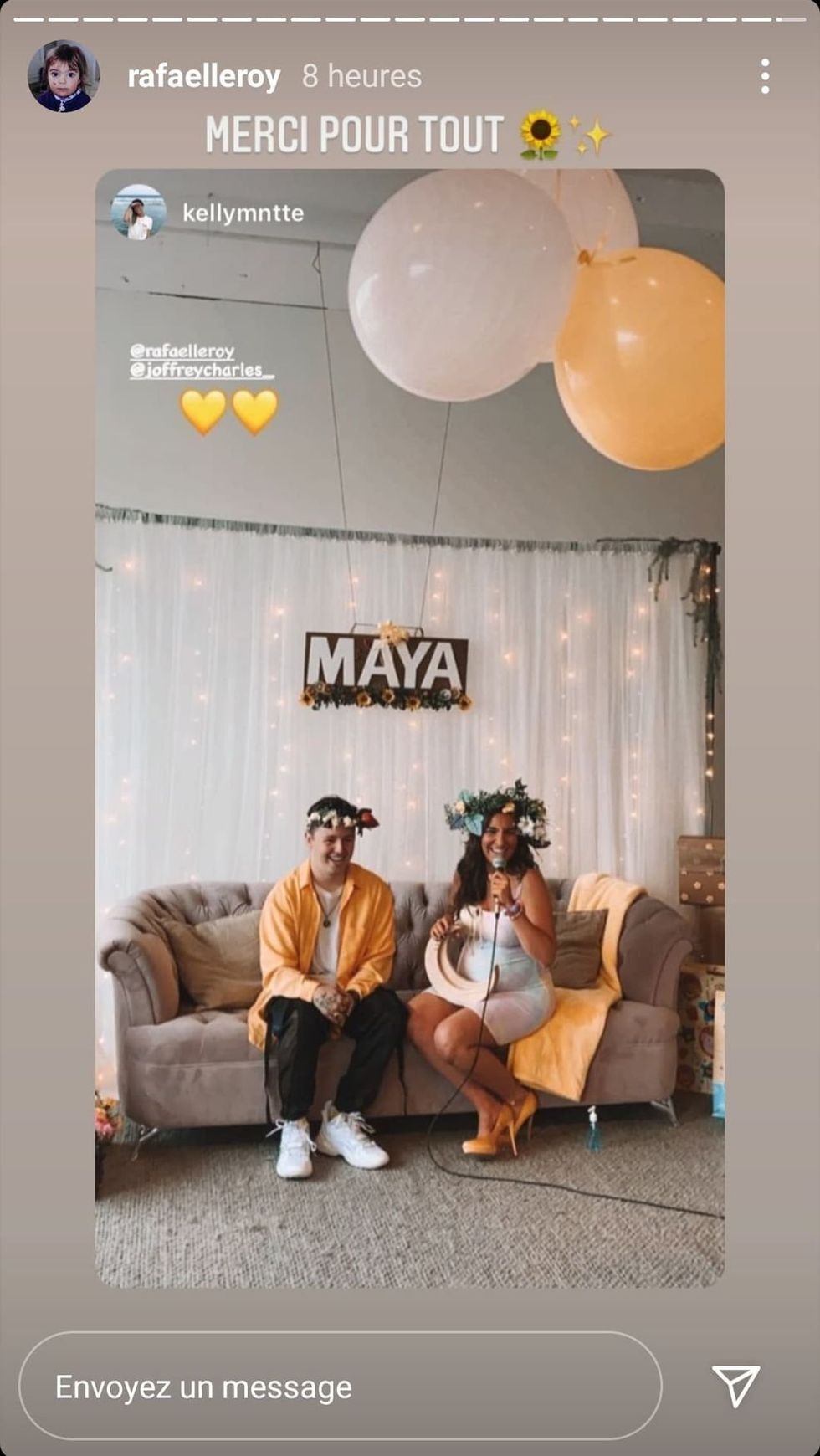 Rafaëlle et Joffrey ont par contre annoncé qu'ils attendent un enfant qui se prénommera Maya, tout comme indiqué sur l'enseigne au-dessus de leur tête.