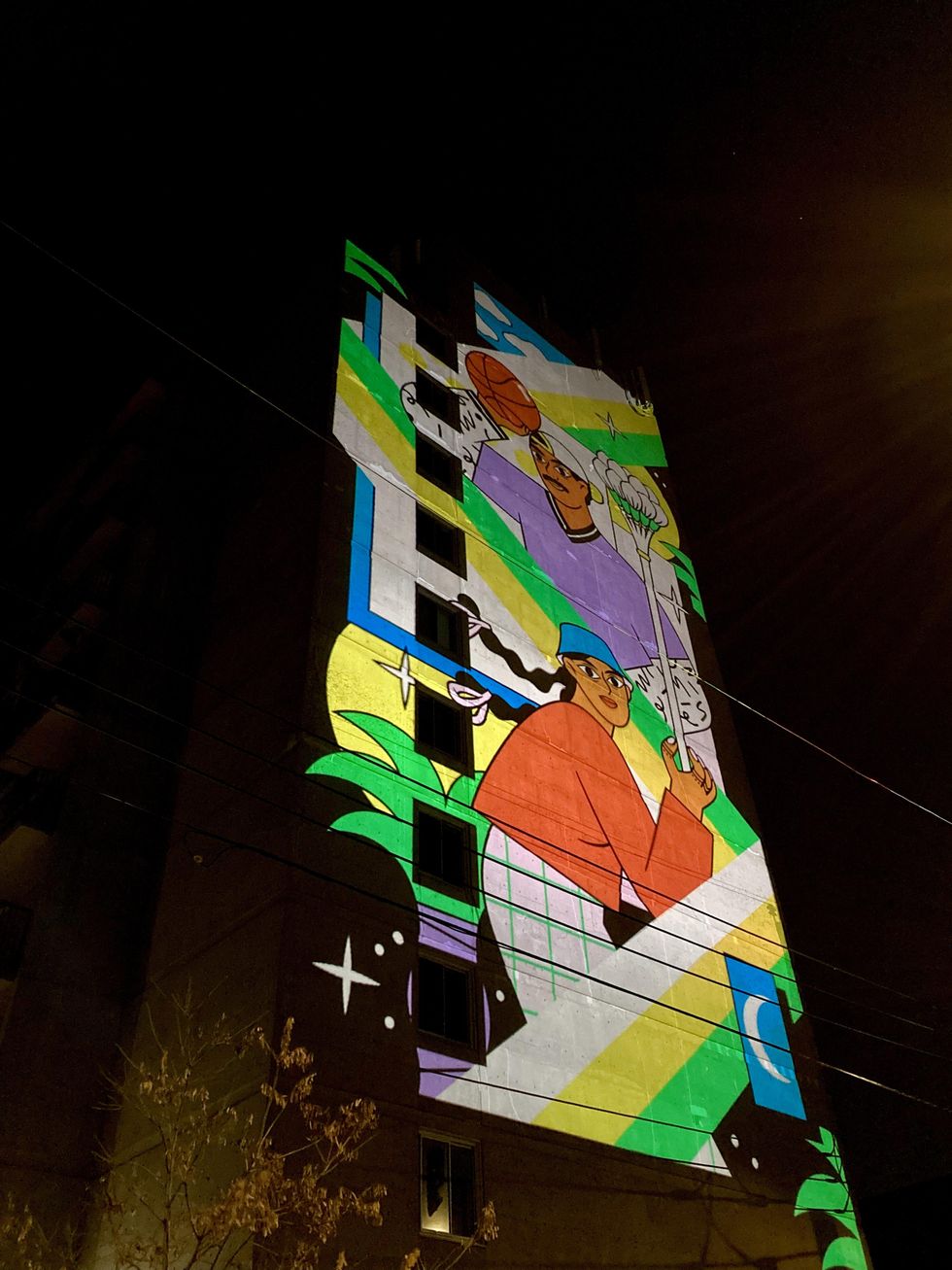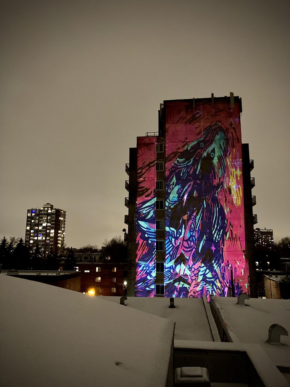 Des artistes à Montréal projettent des murales sur un mur de 13 étages