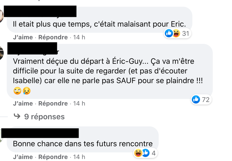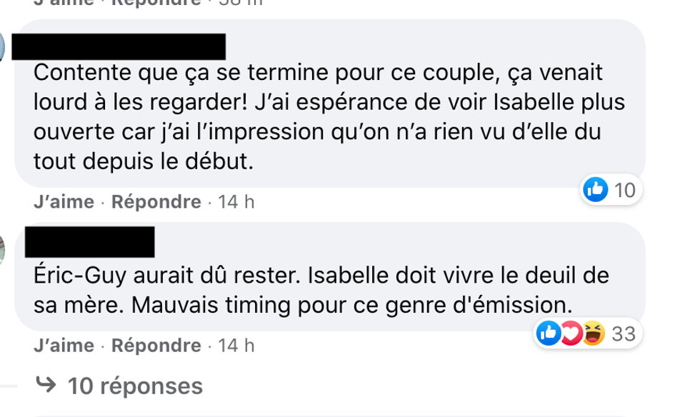 Certain.es auraient préféré voir Éric-Guy poursuivre son cheminement avec une troisième comparse, mais celui-ci a avoué qu'il avait « tout donné » et qu'il en « aura d'autres ailleurs ».