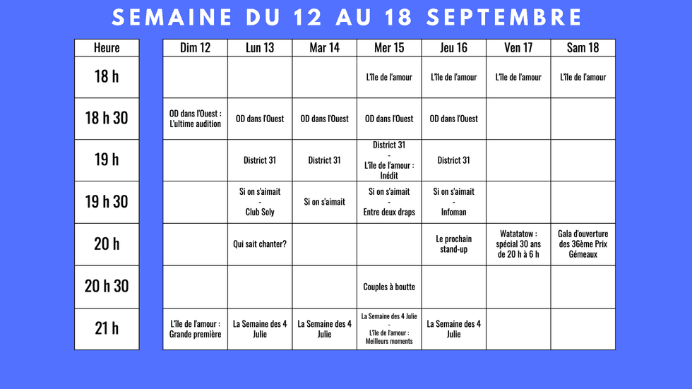Voici donc, dans un même calendrier, tout ce qui se passe à la télévision du dimanche 12 septembre au samedi 25 septembre.